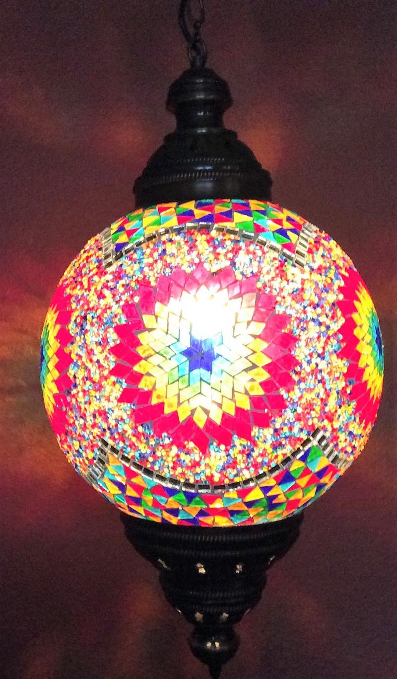 All of our Lamps and Chandaliers are handcrafted and Imported from Turkey. The Lamps mesmirize everone who gazes upon them. They are definately mood changers in a happy way! Our customers have hung them in their Homes, Massage Studios and Therapy Offices, They have a tranquil effect and give off a soothing ambiant light.