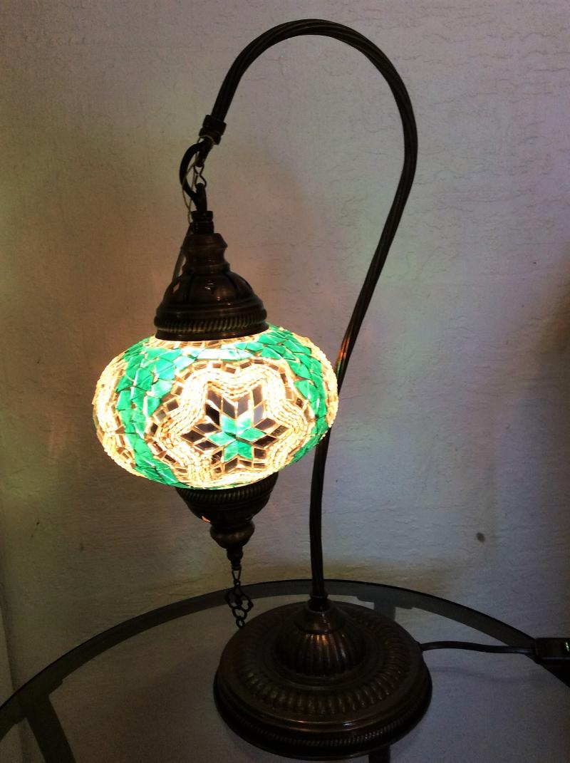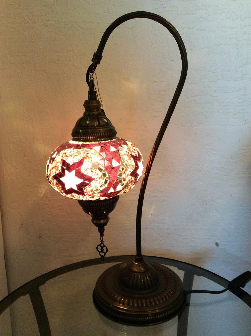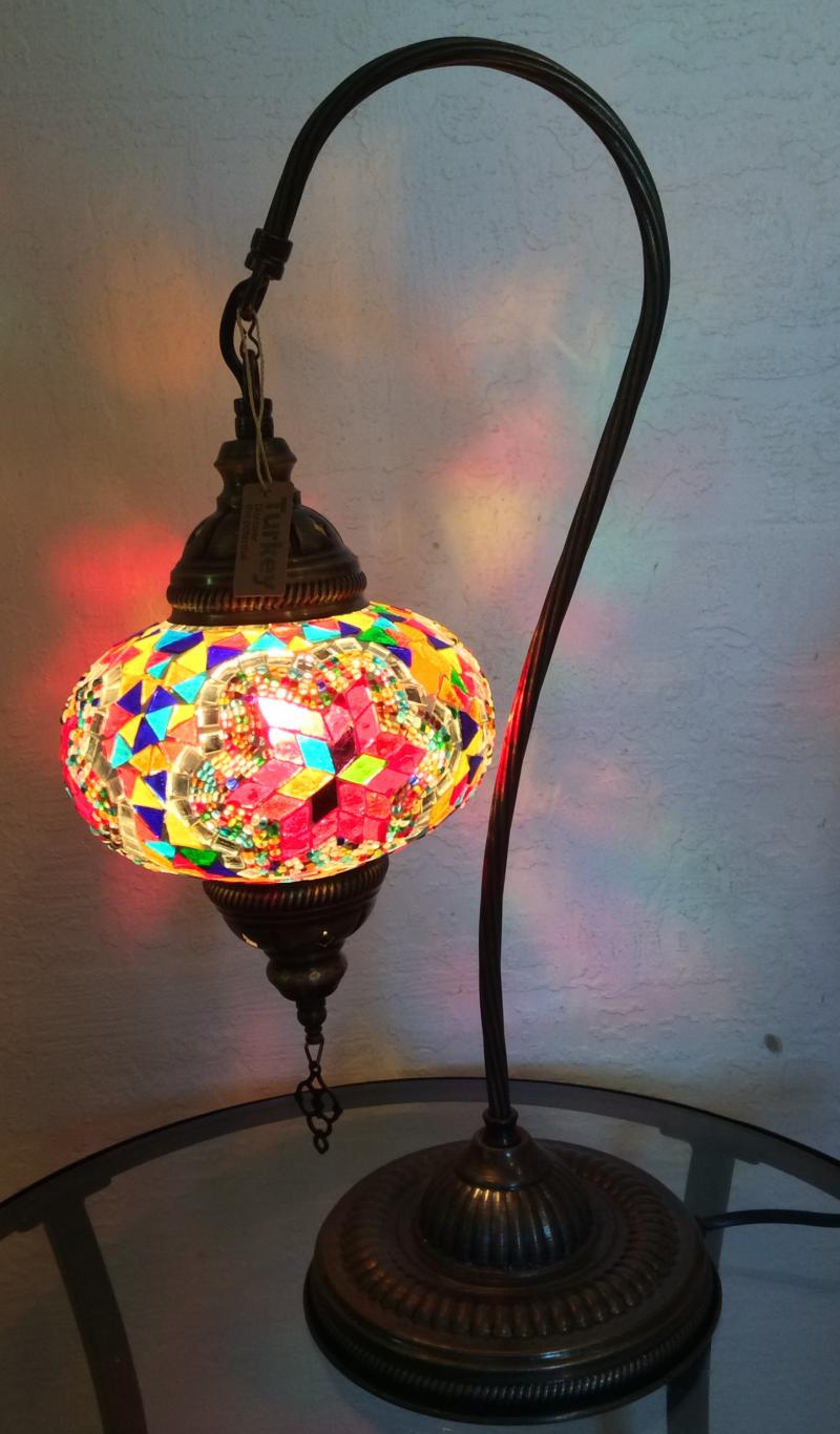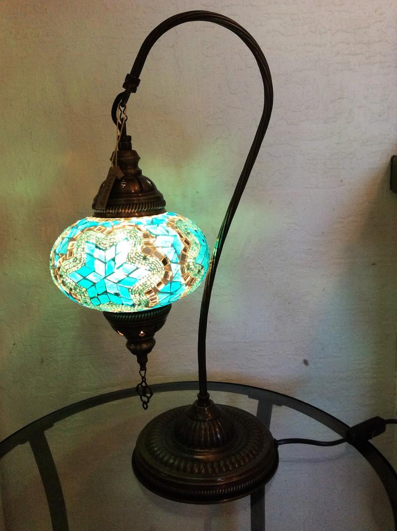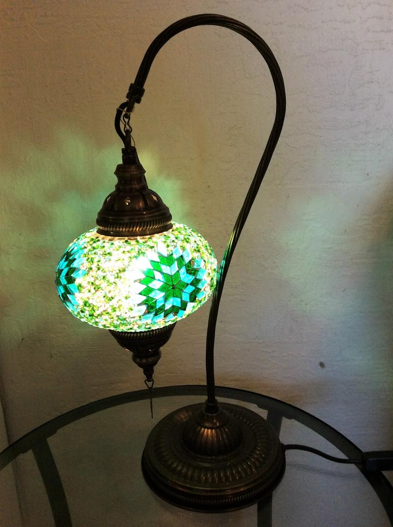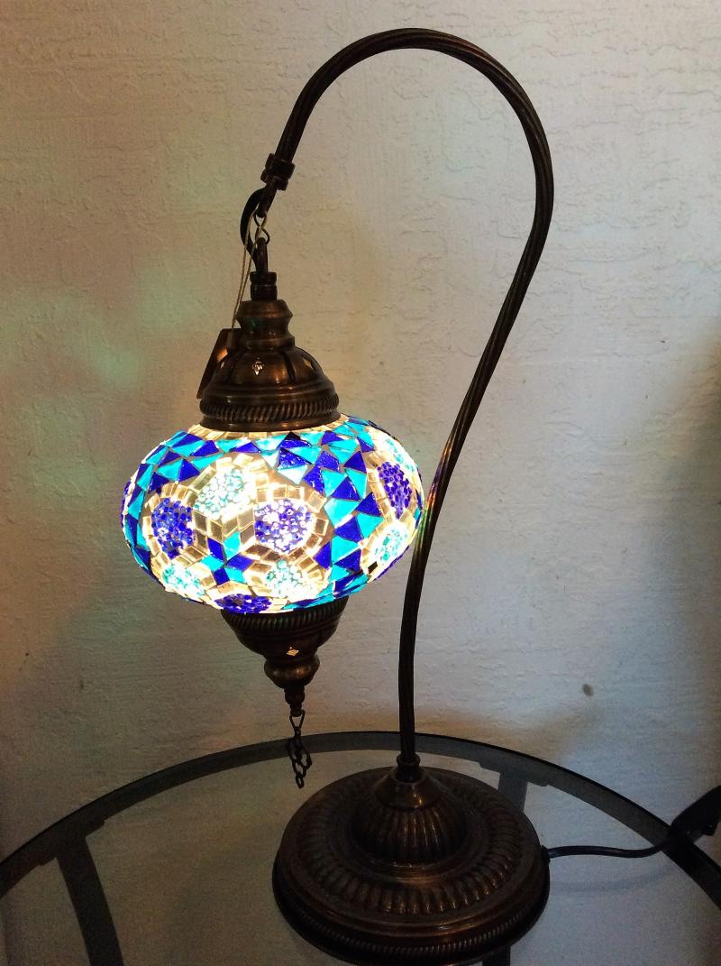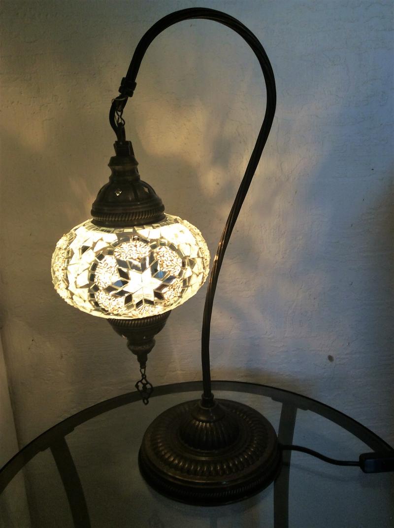 These small swan neck table lamps are our hottest sellers! Fits on any small table, night stand or entry way. gives off warm soft light and design reflects on wall from the artistic mosaic globe. comes with US plug & socket. Toggle switch on cord. Globe is 20in. in diameter. lamp stand is 19in. in height. Uses 15w crystal clear chandalier bulb.