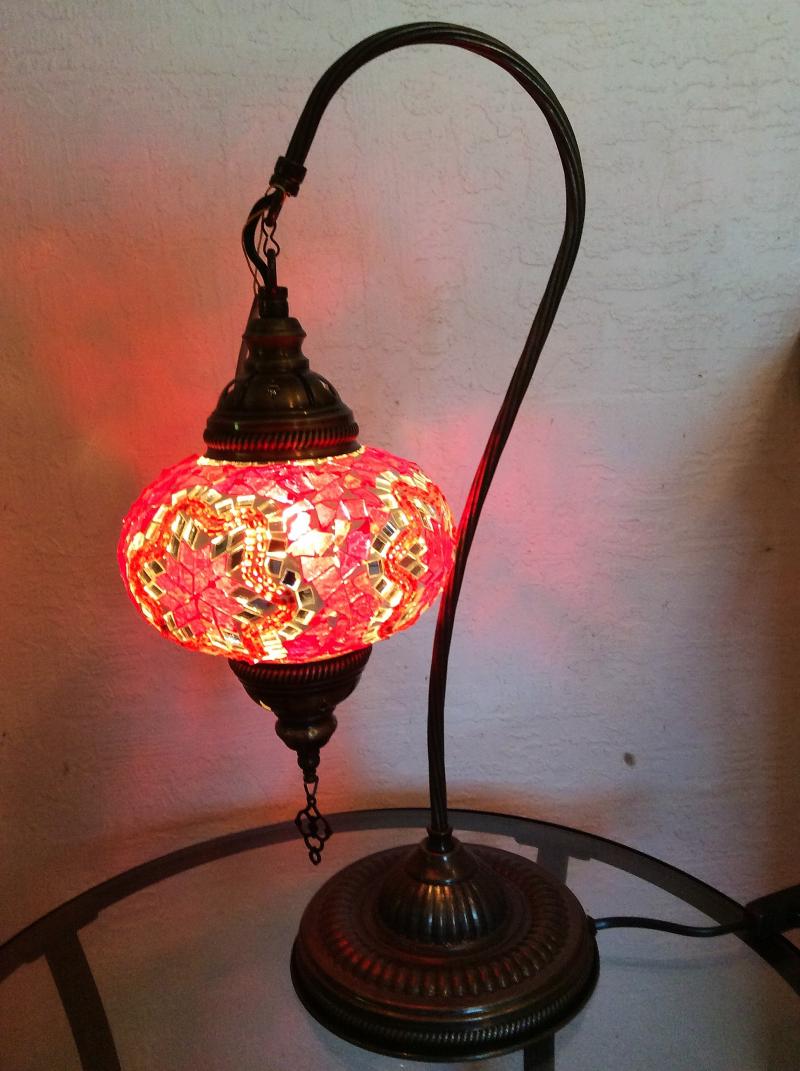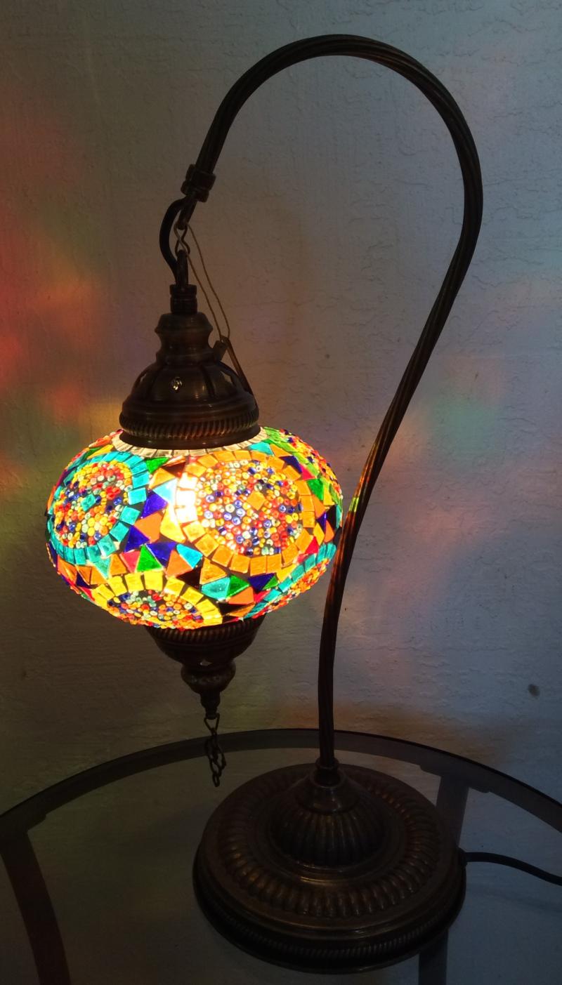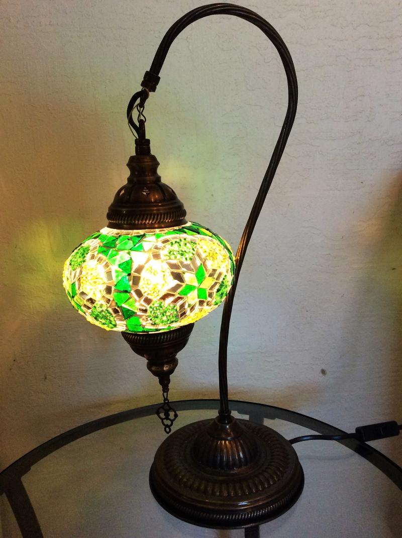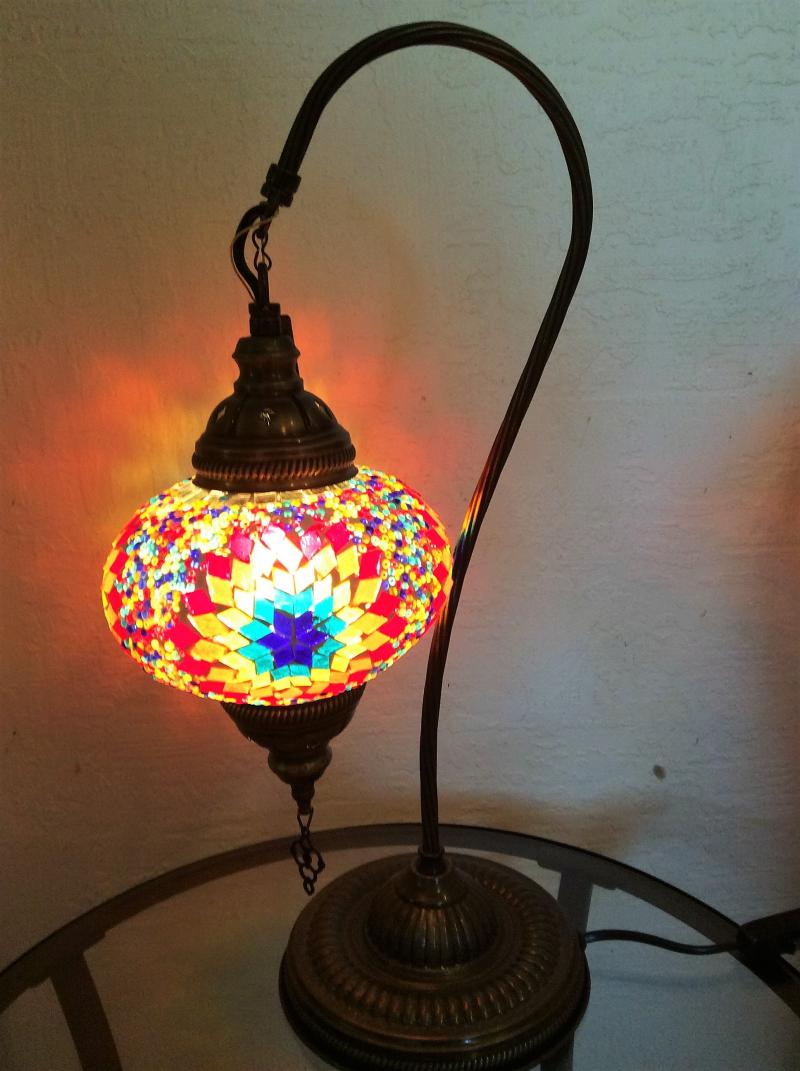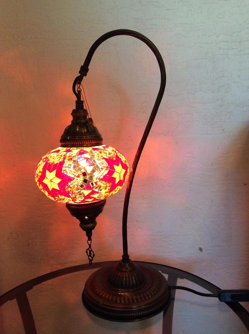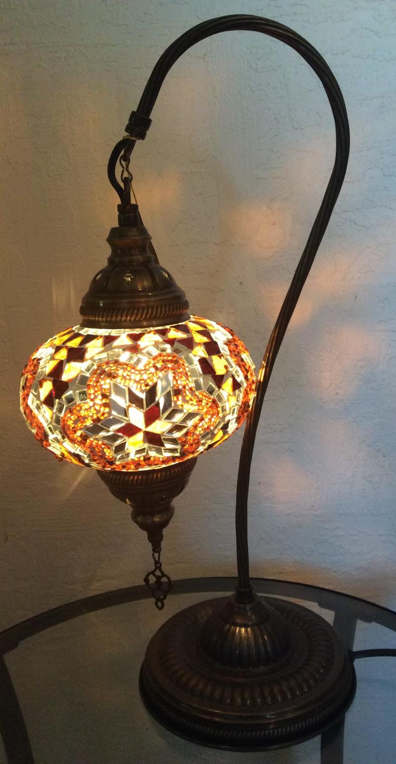 These small swan neck table lamps are our hottest sellers! Fits on any small table, night stand or entry way. gives off warm soft light and design reflects on wall from the artistic mosaic globe. comes with US plug & socket. Toggle switch on cord. Globe is 20in. in diameter. lamp stand is 19in. in height. Uses 15w crystal clear chandalier bulb.